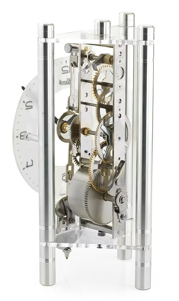 Skelettierte dreieckige Tischuhr im puristischen Design mit Aluminiumstützen, gläsernem Analogzifferblatt, Pendel und Kunststoffelementen, ausgestattet mit einem mechanischen Uhrwerk mit acht Tagen Gangreserve.