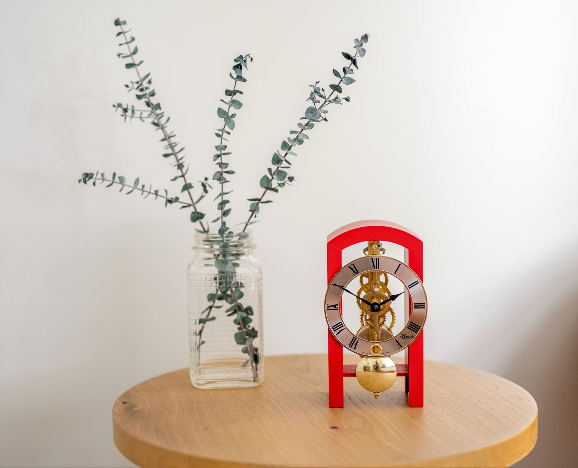 Moderne Design-Skelett-Tischuhr aus Holz in roter Farbe, angetrieben durch ein mechanisches Uhrwerk mit vierzehntägiger Gangreserve.