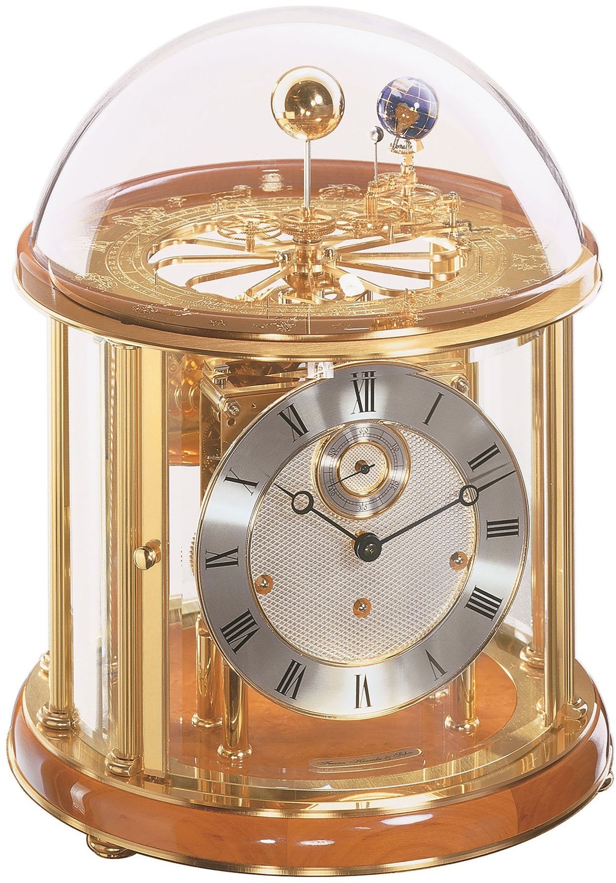 Deutsche Tischuhr mit einem Sockel aus massivem Kirschholz, auf dem klares Mineralglas angebracht ist, das einen Blick auf das Uhrwerk aus verschiedenen Seiten ermöglicht. Die Uhr zeigt nicht nur die Zeit, sondern auch unser Sonnensystem. Im oberen Teil unter der Glaskuppel können wir die aktuelle Position der Erde zur Sonne, die Erdrotation um die eigene Achse und auch die Reproduktion der von der Erde sichtbaren Mondphasen sehen. Auf der polierten Messingscheibe befinden sich gravierte Tierkreiszeichen und daneben Rosetten mit eingravierten Monaten und Tagen im Jahr. Die Uhr verfügt über eine automatische Nachtabschaltung des Schlagwerks. All dies wird durch ein mechanisches Uhrwerk mit 11 Steinen gewährleistet, das alle acht Tage aufgezogen wird. Alle 15 Minuten schlägt es und spielt gleichzeitig auf 4 polierten Glocken die Westminster-Melodie, deren Länge mit der Zeit zunimmt. Das Schlagwerk und die Melodie können manuell abgeschaltet werden.