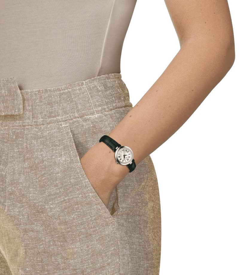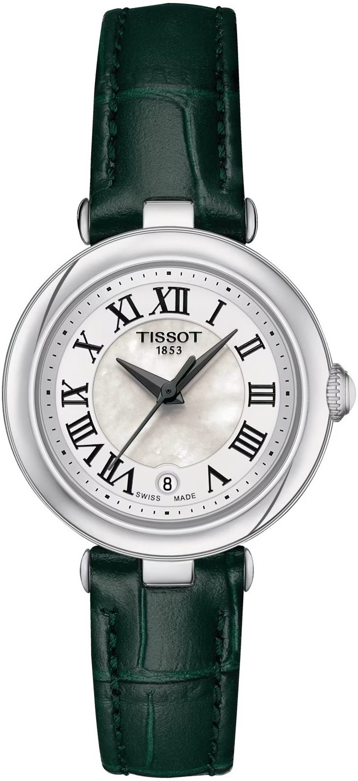 Tissot Bellissima Small Lady T126.010.16.113.02 sind elegante Damenuhren mit Batterieantrieb auf einem dunkelgrünen Lederarmband mit Butterfly-Schließe. Das Edelstahlgehäuse hat einen Durchmesser von 26 Millimetern. Das silberne Zifferblatt mit Datumsanzeige auf sechs Uhr und einem Perlmuttzentrum wird durch ein widerstandsfähiges Saphirglas mit Antireflexbeschichtung geschützt. Der Antrieb der Uhr erfolgt durch ein Schweizer Quarzwerk ETA F03.111 mit Batteriestandsanzeige. Mit einer Wasserdichtigkeit von 5 ATM ist die Uhr gegen Regen und beim Duschen geschützt.