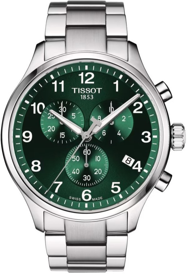 Tissot Chrono XL T116.617.11.092.00 sind Herren-Sportbatterieuhren mit einem Stahlarmband mit Klappverschluss. Das Edelstahlgehäuse hat einen Durchmesser von 45 Millimetern. Das grüne Zifferblatt mit Sonnenschliff-Effekt, Stoppuhr und Datumsanzeige ist durch ein widerstandsfähiges Saphirglas geschützt. Die Zeiger sind mit einer lumineszierenden Schicht Super-LumiNova® überzogen, die perfekte Ablesbarkeit bei schlechten Lichtverhältnissen garantiert. Das Uhrwerk wird durch ein Quarzwerk ETA G10.212 mit Batteriestandsanzeige angetrieben. Mit einer Wasserdichtigkeit von 10 ATM sind die Uhren zum Schwimmen oder Schnorcheln geeignet.