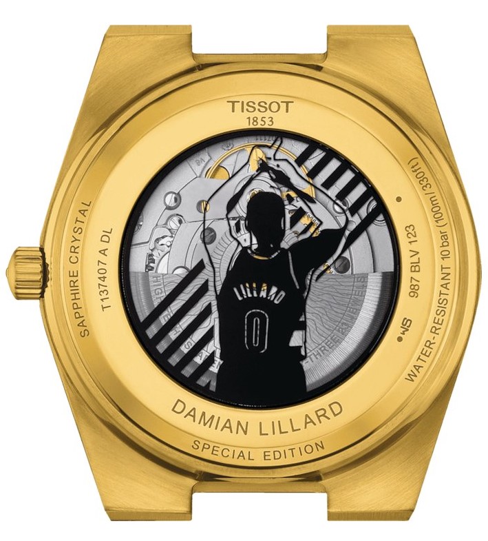 Tissot PRX Powermatic 80 Damian Lillard Special Edition T137.407.33.051.00 sind Herren-Automatikuhren mit einem integrierten Stahlarmband mit goldfarbener PVD-Beschichtung und einer Faltschließe. Es handelt sich um eine Sonderedition, die dem amerikanischen Profibasketballspieler Damian Lillard gewidmet ist, einem der Hauptstars des NBA-Teams Milwaukee Bucks. Das Gehäuse aus Edelstahl mit goldfarbener PVD-Beschichtung hat einen Durchmesser von 40 Millimetern und einen transparenten Gehäuseboden mit der Silhouette von Damian, der „Dame Time“ feiert. Diese beiden Wörter sind auf der inneren Lünette zusammen mit dem Kürzel „DDKK“ eingraviert, das eine Hommage an seine Familie darstellt, und unten links „YKWTII“, was für „You Know What Time It Is“ steht, das ikonischen Momenten von „Dame Time“ vorausgeht. Das schwarze Zifferblatt mit Datumsanzeige und einem Muster aus Nullen, das auf Damians Trikotnummer verweist, ist durch ein widerstandsfähiges saphirglas mit Antireflexbeschichtung geschützt. Der Sekundenzeiger ist mit Damians Monogramm verziert. Die applizierten Stundenindizes sind ebenso wie die Zeiger mit einer lumineszierenden Beschichtung Super-LumiNova® versehen, die eine perfekte Ablesbarkeit bei schlechten Lichtverhältnissen garantiert. Das Uhrwerk wird von einem mechanischen Powermatic 80 mit automatischem Aufzug und einer Gangreserve von etwa 80 Stunden angetrieben. Dank der Verwendung einer antimagnetischen Unruhspirale Nivachron™ aus einer Titanlegierung, die in Zusammenarbeit mit der Swatch Group und der Manufaktur Audemars Piguet entwickelt wurde, ist dieses Kaliber hochgradig resistent gegen magnetische Einflüsse. Dieses Uhrwerk mit Hacking-Funktion kann bei Bedarf auch manuell über die signierte Krone aufgezogen werden. Die Wasserdichtigkeit der Uhr beträgt 10 ATM und ist somit zum Schwimmen oder Schnorcheln geeignet.