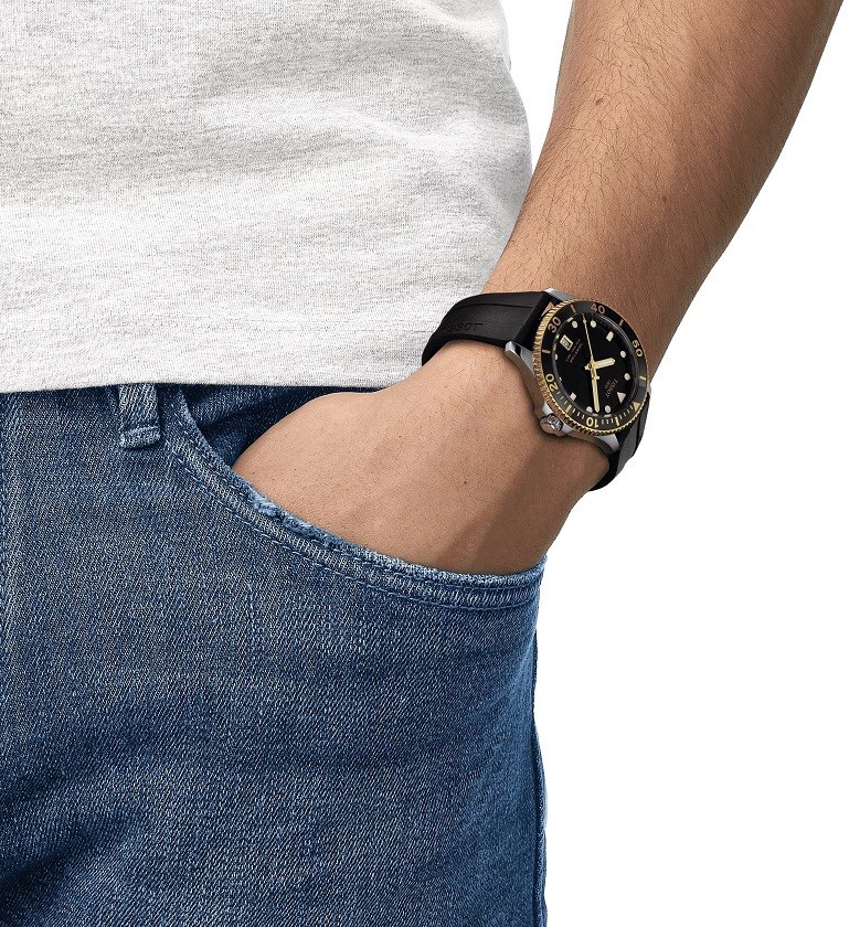 Tissot Seastar 1000 Quartz T120.410.27.051.00 sind batteriebetriebene sportliche Herrenuhren mit einem schwarzen Kautschukarmband mit Dornschließe. Das Edelstahlgehäuse hat einen Durchmesser von 40 Millimetern, eine Lünette mit PVD-Beschichtung in Goldfarbe und eine verschraubte Krone. Das übersichtliche schwarze Zifferblatt mit Datumsanzeige bei sechs Uhr wird durch ein saphirbeschichtetes Glas mit Antireflexschicht geschützt. Die applizierten Stundenindizes sind ebenso wie die Zeiger mit einer lumineszierenden Beschichtung Super-LumiNova® versehen, die eine perfekte Ablesbarkeit bei schlechten Lichtverhältnissen garantiert. Das Uhrwerk wird durch ein Quarzwerk F06.412 mit einer Anzeige für schwache Batterie EOL (End of Life) betrieben. Mit einer Wasserdichtigkeit von 30 ATM sind die Uhren für das Gerätetauchen geeignet.