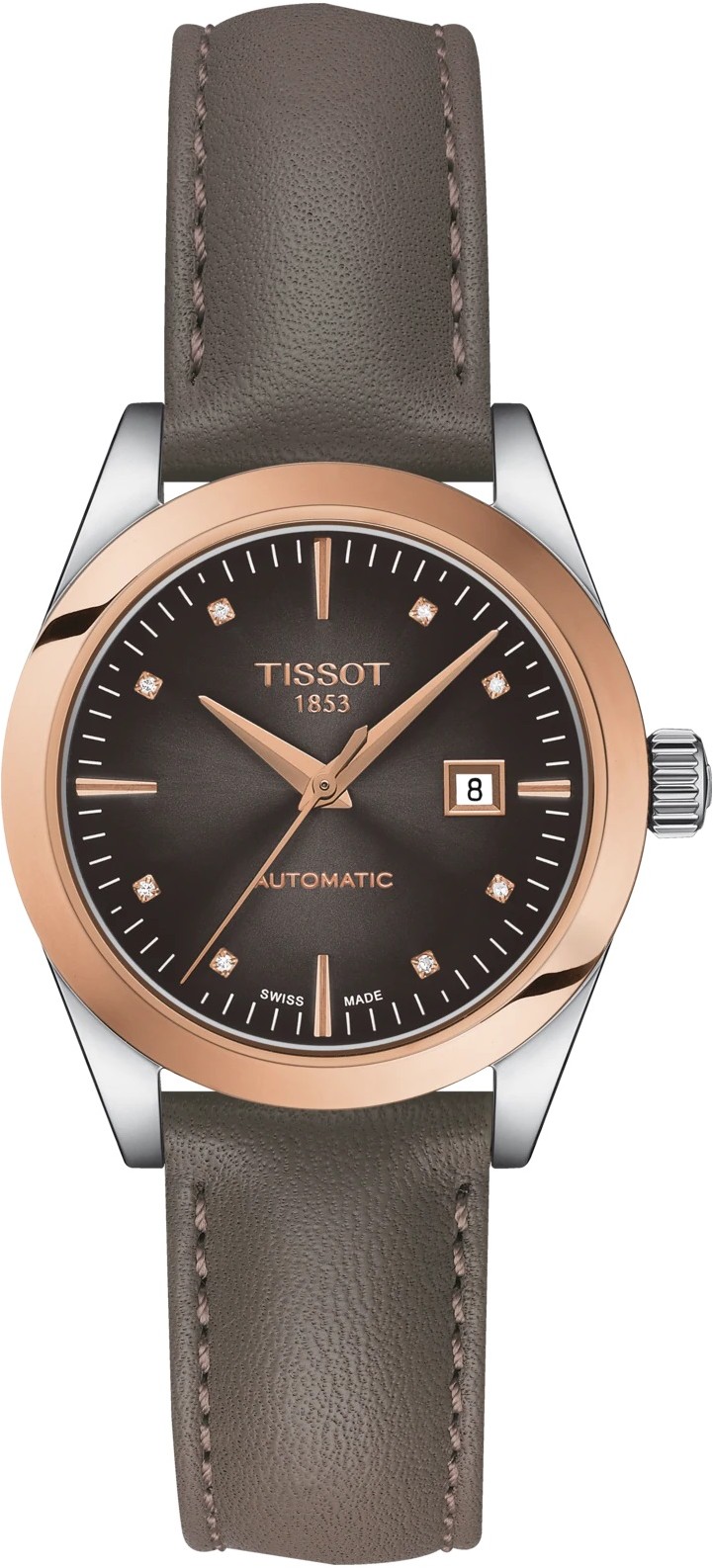 Tissot T-MY Lady Automatic 18k Gold T930.007.46.296.00 sind elegante Damenuhren mit automatischem Aufzug und einem grauen Lederarmband mit Butterfly-Schließe. Das Edelstahlgehäuse hat einen Durchmesser von 29 Millimetern, einen transparenten Gehäuseboden und eine Lünette aus 18-karätigem Roségold. Das braune Zifferblatt mit Sonnenschliff, 8 Diamanten mit einem Gewicht von 0,02 ct und Reinheit VS-SI sowie einer Datumsanzeige bei drei Uhr wird durch ein widerstandsfähiges Saphirglas geschützt. Der Antrieb der Uhr erfolgt durch ein mechanisches Powermatic 48.111 Werk mit automatischem Aufzug und einer Gangreserve von 48 Stunden. Mit einer Wasserdichtigkeit von 5 ATM ist die Uhr gegen Regen und beim Duschen geschützt.