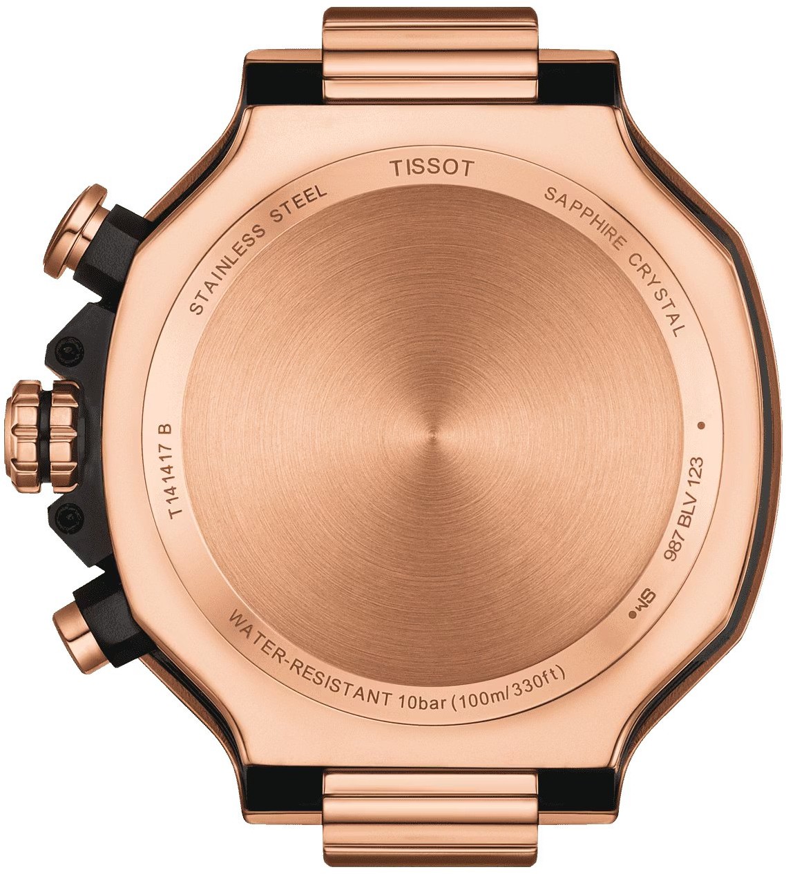 Tissot T-Race Chronograph T141.417.37.051.00 sind Herren-Quarz-Sportuhren mit einem schwarzen Silikonarmband und Dornschließe. Das Gehäuse aus Edelstahl mit PVD-Beschichtung in Roségold hat einen Durchmesser von 45 Millimetern und eine innere Lünette mit Tachymeterskala. Das schwarze strukturierte Zifferblatt mit Datumsanzeige und Chronograph ist durch ein widerstandsfähiges Saphirglas mit Antireflexbeschichtung geschützt. Die aufgebrachten Stundenindizes sind ebenso wie die Zeiger mit einer Leuchtbeschichtung Super-LumiNova® versehen, die perfekte Ablesbarkeit bei schlechten Lichtverhältnissen garantiert. Das Uhrwerk wird durch ein Quarzwerk ETA G10.212 mit einer Genauigkeit von +/- 10 Sekunden pro Jahr und einer Anzeige für schwache Batterie angetrieben. Die Wasserdichtigkeit der Uhr beträgt 10 ATM und ist somit zum Schwimmen oder Schnorcheln geeignet.