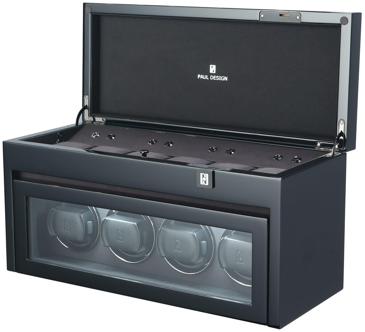 Uhrenbeweger (watch winder) von der Firma Paul Design für vier Uhren mit Stauraum für weitere sechs Uhren. Die handgefertigte Box ist in Black Highgloss ausgeführt und mit LED-Beleuchtung ausgestattet.