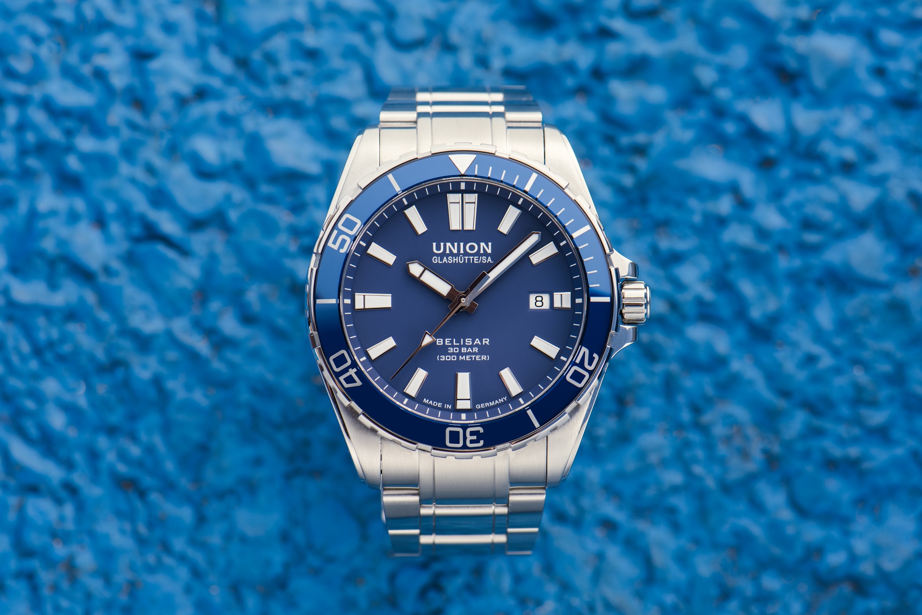 Union Glashütte Belisar Date Sport Pro D014.907.11.041.00 sind klassische Herren-Automatikuhr mit Edelstahlarmband und Faltschließe. Das Edelstahlgehäuse hat einen Durchmesser von 42 Millimetern, eine verschraubte Krone und einen transparenten Gehäuseboden. Das blaue Zifferblatt mit Datumsanzeige auf der Drei-Uhr-Position wird durch ein widerstandsfähiges Saphirglas mit Antireflexbeschichtung geschützt. Die Zeiger und Indizes sind mit einer Leuchtbeschichtung Super-LumiNova® versehen, die perfekte Ablesbarkeit bei schlechten Lichtverhältnissen garantiert. Das Uhrwerk wird durch das mechanische Werk UNG-07.S1 mit automatischem Aufzug und einer Gangreserve von 60 Stunden angetrieben. Mit einer Wasserdichtigkeit von 30 ATM ist die Uhr für das Gerätetauchen geeignet.