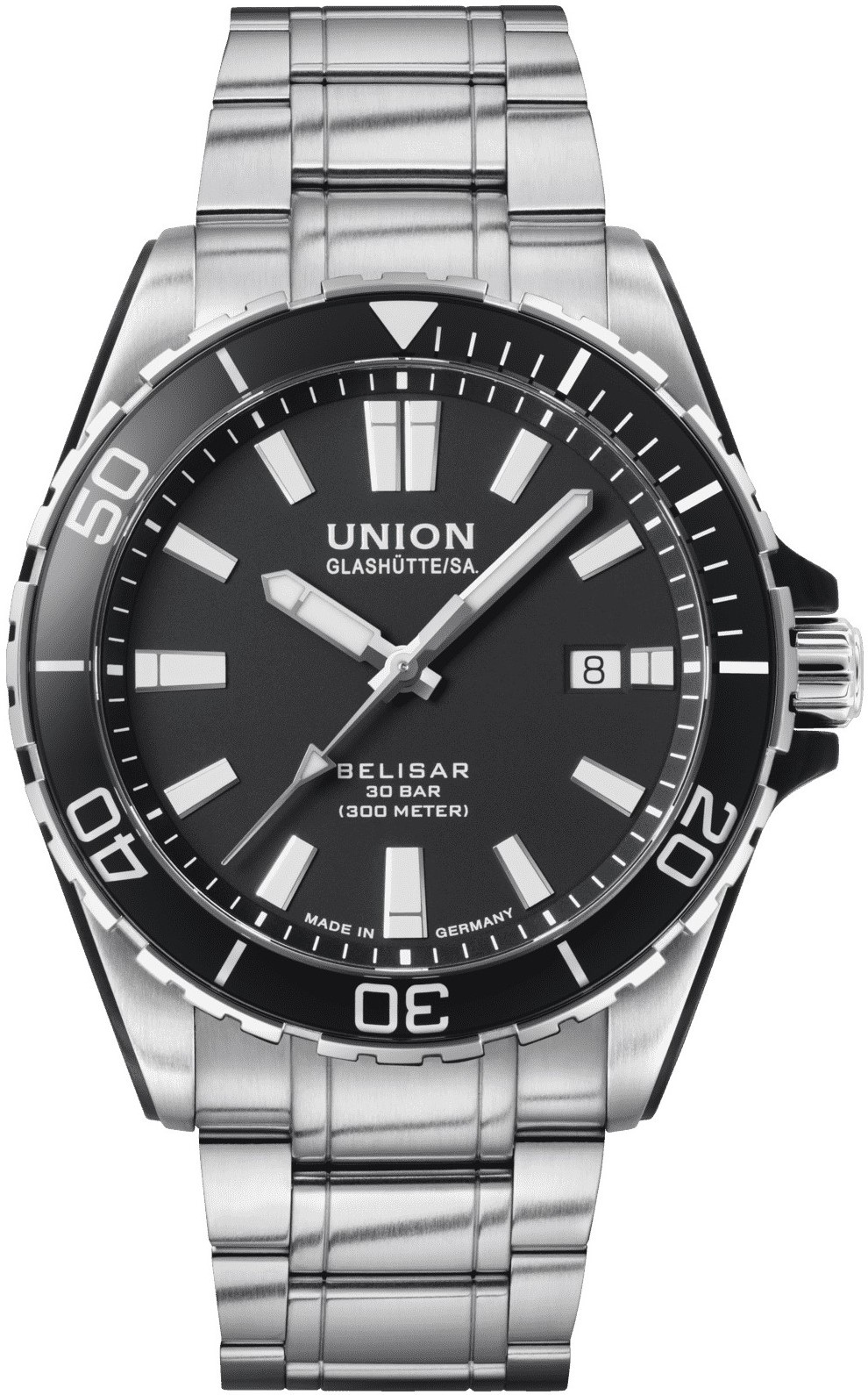 Union Glashütte Belisar Date Sport Pro D014.907.11.051.00 sind klassische Herren-Automatikuhr mit Edelstahlarmband und Faltschließe. Das Edelstahlgehäuse hat einen Durchmesser von 42 Millimetern, eine verschraubte Krone und einen transparenten Gehäuseboden. Das schwarze Zifferblatt mit Datumsanzeige auf der Drei-Uhr-Position wird durch ein widerstandsfähiges Saphirglas mit Antireflexbeschichtung geschützt. Die Zeiger und Indizes sind mit einer Leuchtbeschichtung Super-LumiNova® versehen, die perfekte Ablesbarkeit bei schlechten Lichtverhältnissen garantiert. Das Uhrwerk wird durch das mechanische Werk UNG-07.S1 mit automatischem Aufzug und einer Gangreserve von 60 Stunden angetrieben. Mit einer Wasserdichtigkeit von 30 ATM ist die Uhr für das Gerätetauchen geeignet.