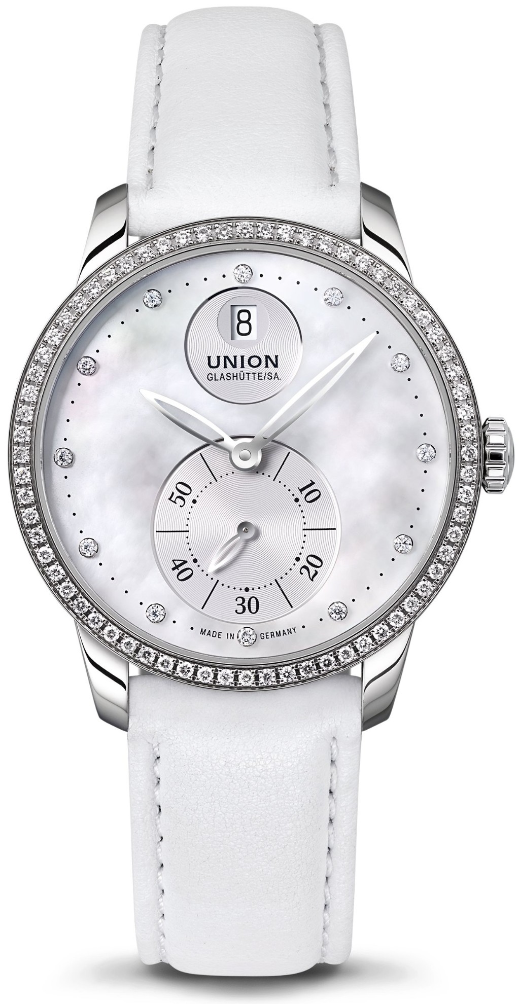 Union Glashütte Seris D013.228.66.116.00 sind Damen-Automatikuhr mit einem weißen Lederarmband und einer Faltschließe. Das Edelstahlgehäuse hat einen Durchmesser von 36 Millimetern, einen transparenten Boden und eine Lünette, die mit 68 Diamanten Top Wesselton mit einem Gewicht von 0,68 ct und Reinheit TW/SI verziert ist. Das Perlmuttzifferblatt mit Datumsanzeige, dezentralem Sekundenzeiger und 12 Diamanten Top Wesselton mit einem Gewicht von 0,10 ct wird durch ein widerstandsfähiges Saphirglas mit Antireflexbeschichtung geschützt und seine Schönheit kommt besonders bei direktem Licht zur Geltung, wenn man das Farbspiel der Perlmutt beobachten kann. Der Antrieb der Uhr erfolgt durch ein mechanisches Werk UNG-28.01 mit automatischem Aufzug und einer Gangreserve von 60 Stunden. Dieses Werk mit Hacking-Funktion kann bei Bedarf auch manuell über die Krone aufgezogen werden. Mit einer Wasserdichtigkeit von 5 ATM ist die Uhr gegen Regen und beim Duschen geschützt.