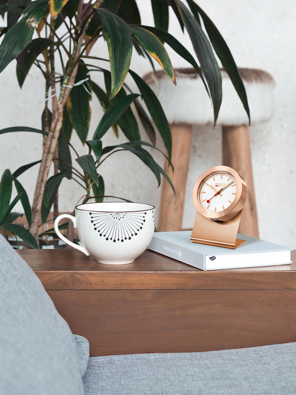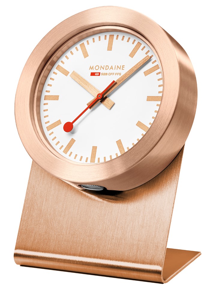 MONDAINE A660.30318.82SBK ist eine Uhr, deren Aluminiumgehäuse in Roségoldfarbe einen Durchmesser von 50 Millimetern hat. Dank des Magneten, der sich auf der Rückseite befindet, können Sie die Uhr entweder auf den im Lieferumfang enthaltenen Ständer oder auf andere Metalloberflächen stellen. Das Zifferblatt in Weiß wird durch gehärtetes Mineralglas geschützt und ist von den ikonischen Bahnhofsuhr mit rotem Sekundenzeiger inspiriert. Der Antrieb der Uhr wird durch ein Quarzwerk gewährleistet.