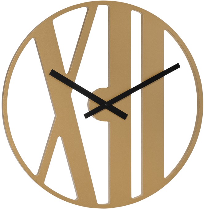 Wandquarzuhr in goldener Farbe mit schwarzen Zeigern im modernen Design mit transparentem Zifferblatt und römischen Ziffern XII.