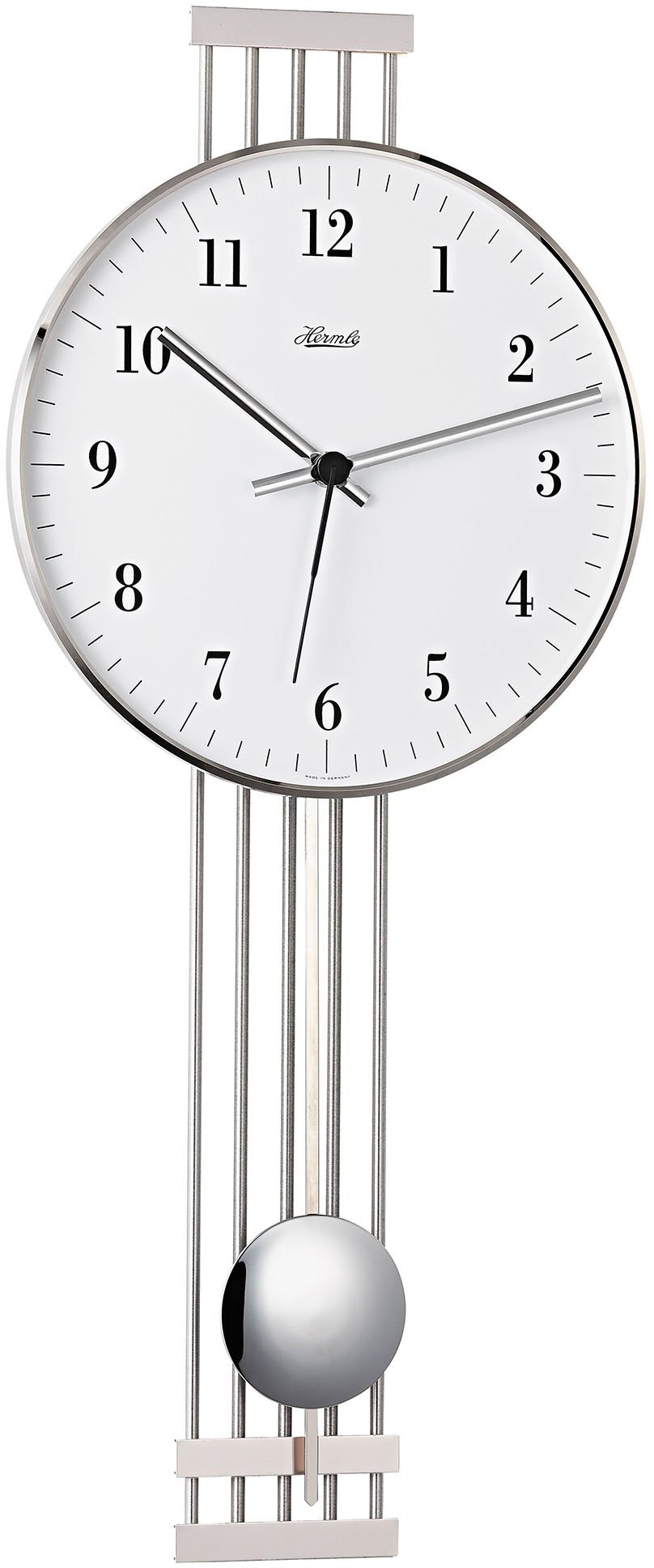 Wandpendeluhr in Nickeloptik mit weißem Zifferblatt und schwarzen arabischen Zahlen. Die Uhr wird durch Funksignal gesteuert, was Präzision und Komfort bietet, da sich die Uhr ohne manuellen Eingriff selbst einstellt.