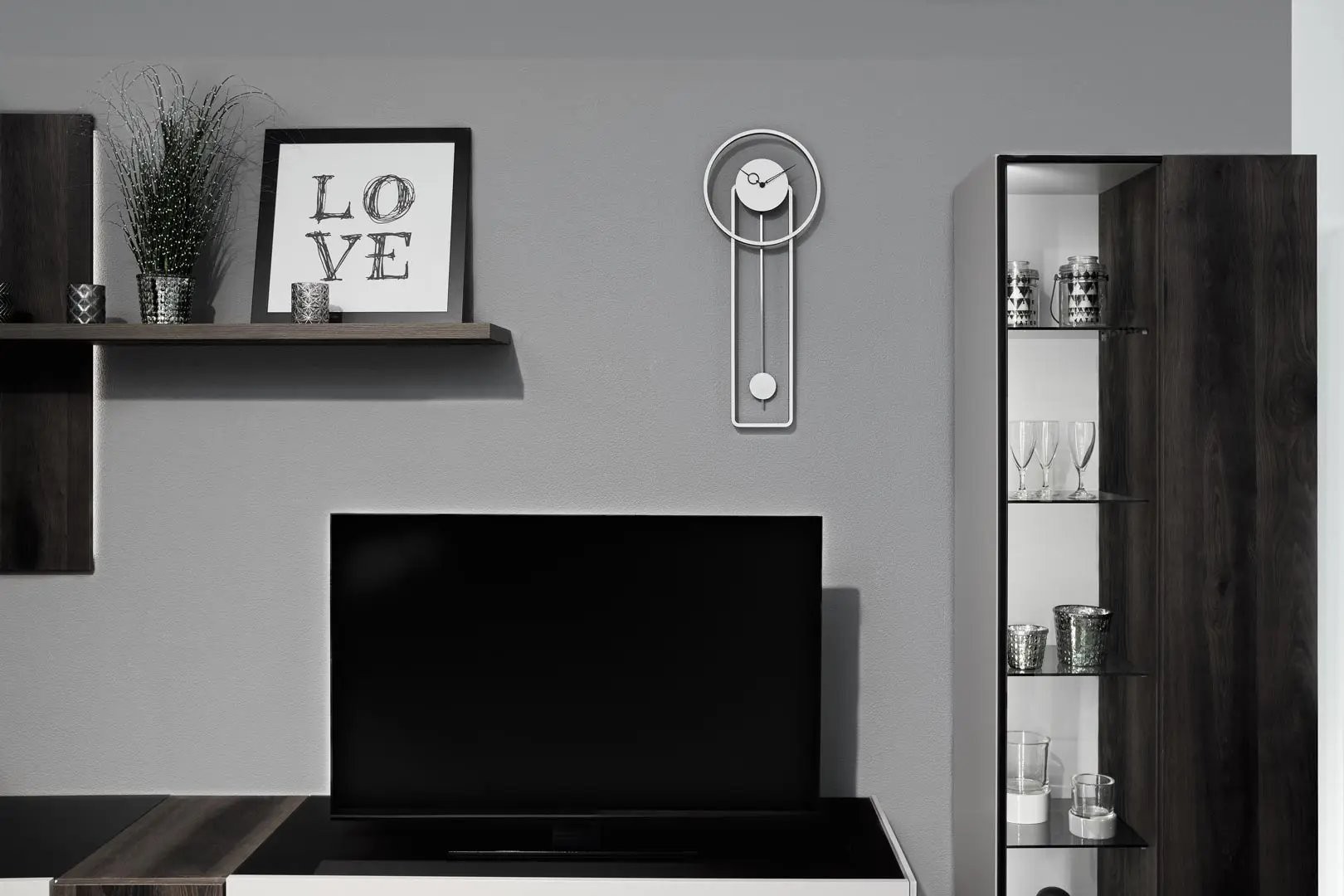 Elegante Designuhr aus MDF-Material in weiß-schwarzer Ausführung mit batteriebetriebenem Pendelwerk.