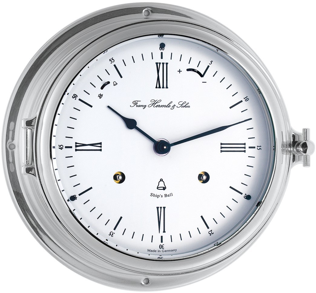 Wand-Schiffsuhr mit emailliertem weißen Zifferblatt mit römischen Ziffern. Der Gang der Uhr wird durch ein mechanisches Uhrwerk mit acht Tagen Gangreserve gewährleistet, das zur halben und vollen Stunde schlägt. Der Schlag kann manuell ausgeschaltet werden.