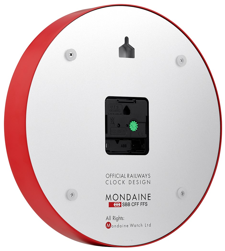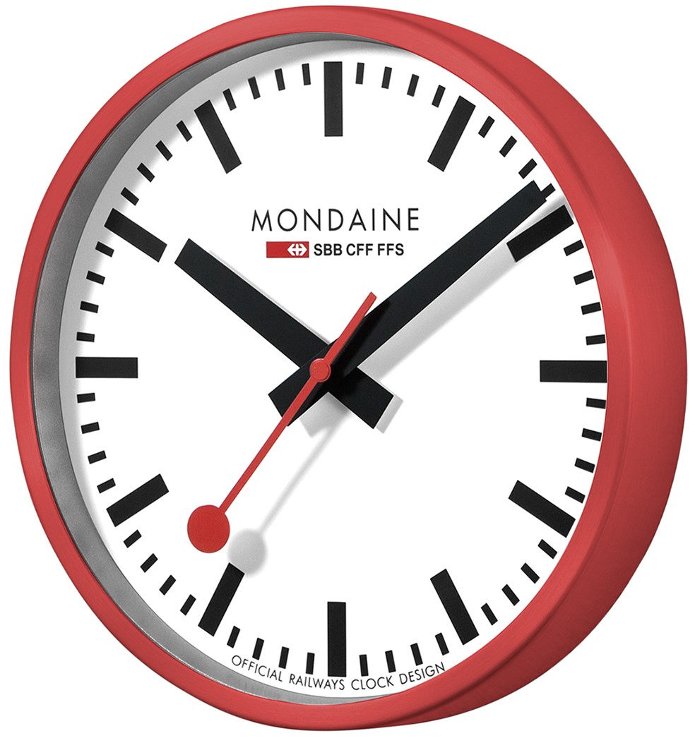 MONDAINE A990.CLOCK.11SBC ist eine Wanduhr mit einem roten Aluminiumgehäuse mit einem Durchmesser von 250 Millimetern. Das Zifferblatt in mattem Weiß wird durch ein gehärtetes Mineralglas geschützt und ist von den ikonischen Bahnhofsuhrendesigns mit einem roten Sekundenzeiger inspiriert. Der Uhrbetrieb wird durch ein Quarzwerk gewährleistet.