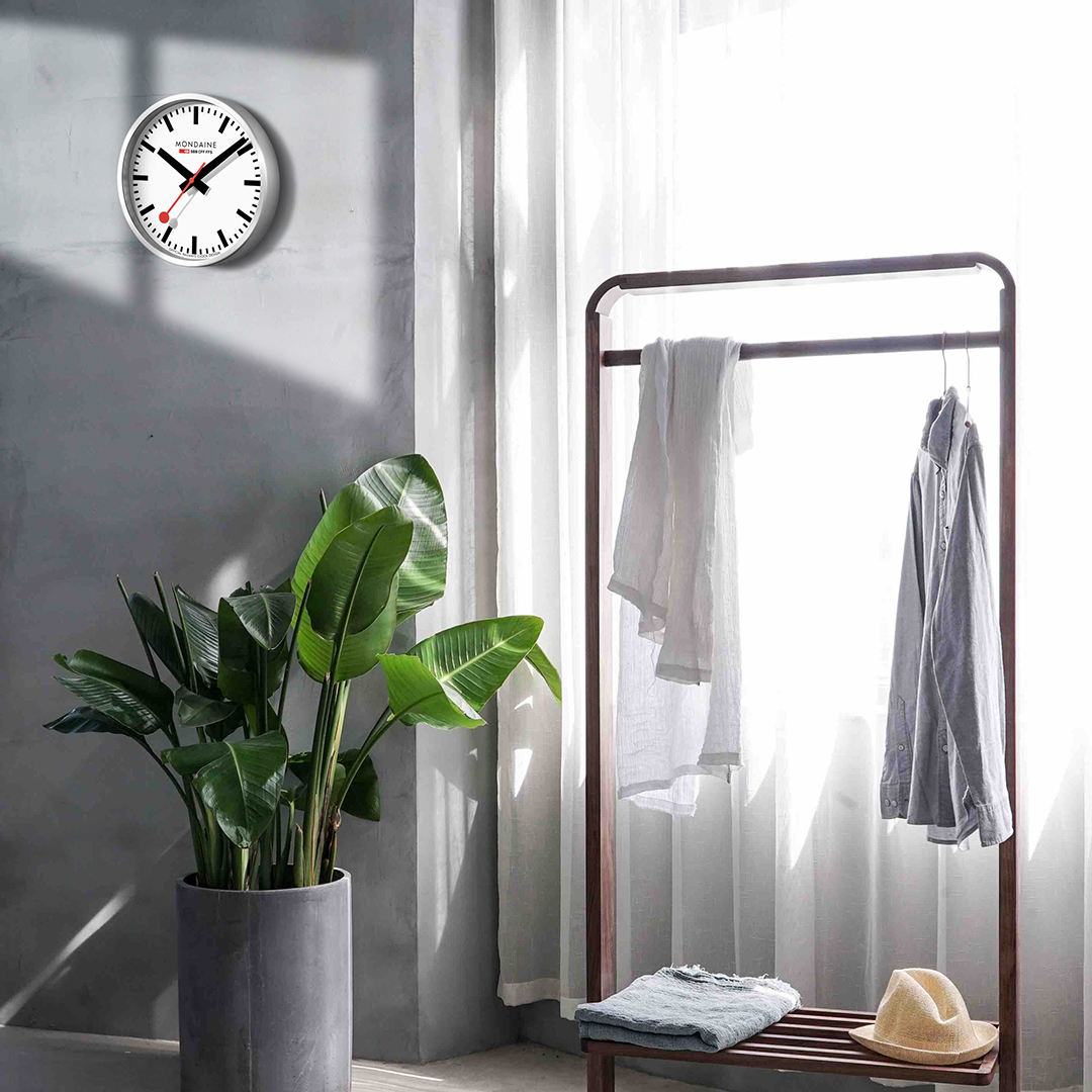 MONDAINE A995.CLOCK.16SBB ist eine Wanduhr mit einem Aluminiumgehäuse mit einem Durchmesser von 400 Millimetern. Das Zifferblatt in mattem Weiß ist durch ein gehärtetes Mineralglas geschützt und inspiriert von den ikonischen Bahnhofsuhrendesigns mit einem roten Sekundenzeiger. Der Uhrbetrieb wird durch ein Quarzwerk gewährleistet.