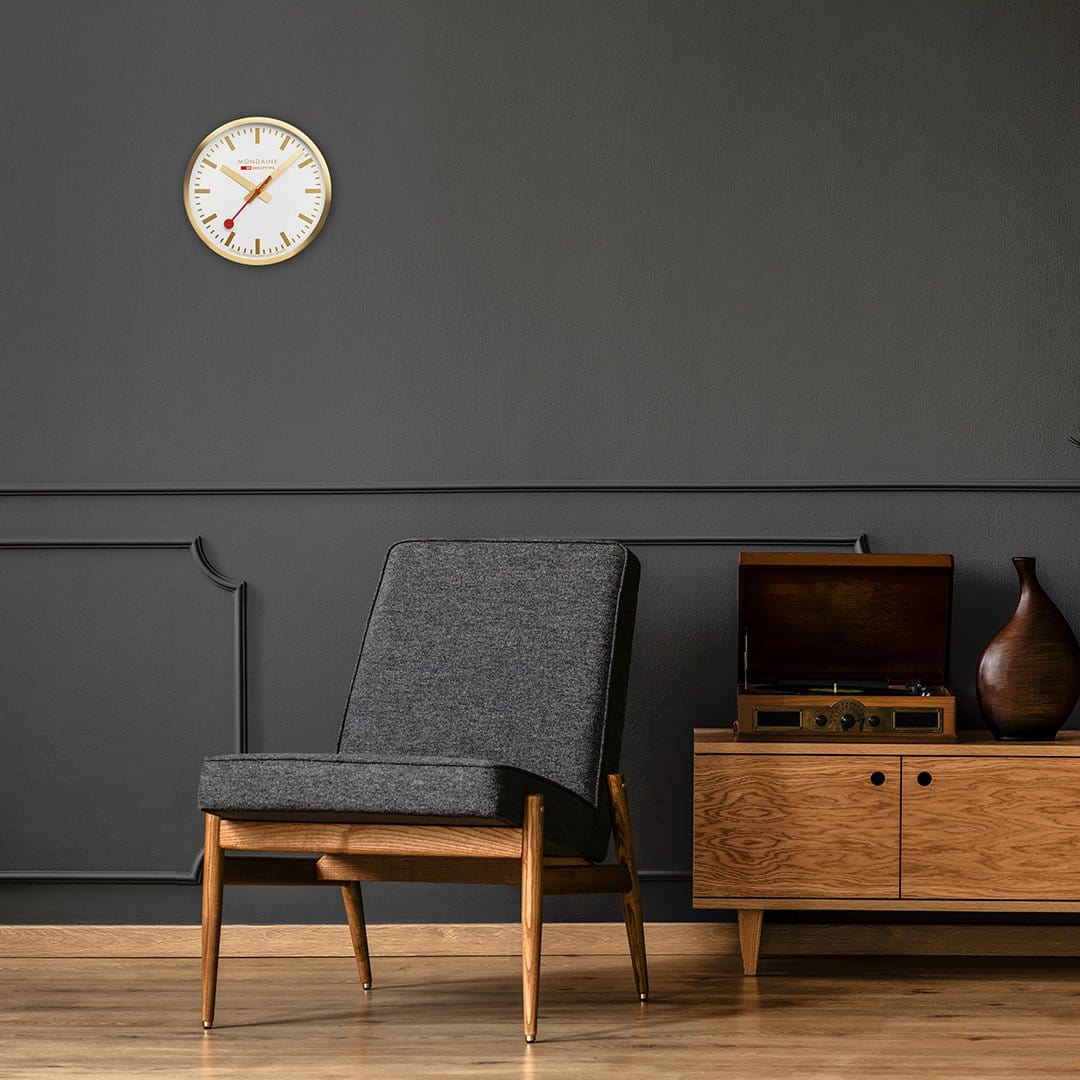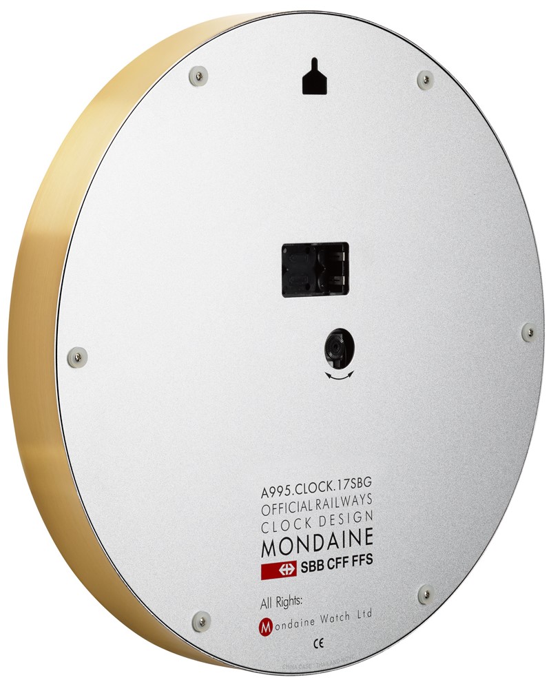 MONDAINE A995.CLOCK.17SBG ist eine Wanduhr mit einem Aluminiumgehäuse in Goldfarbe mit einem Durchmesser von 400 Millimetern. Das Zifferblatt in mattem Weiß wird durch gehärtetes Mineralglas geschützt und ist von den ikonischen Bahnhofsuhr mit rotem Sekundenzeiger inspiriert. Der Uhrbetrieb wird durch ein Quarzwerk gewährleistet.